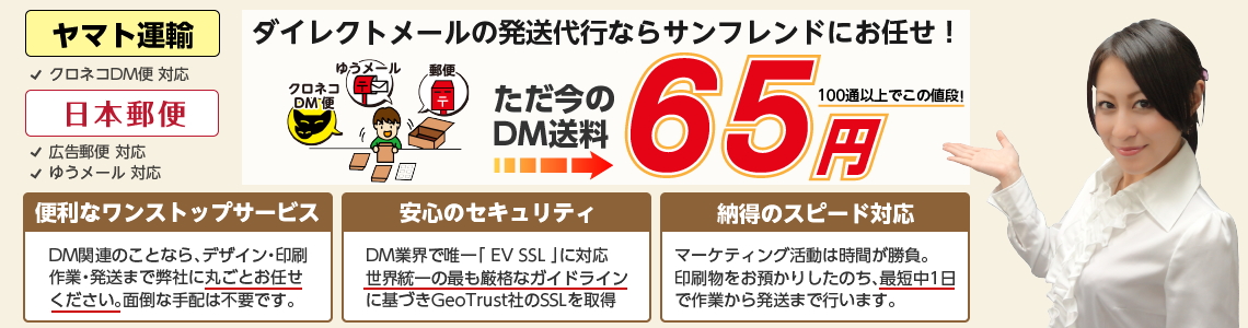 サンフレンドは、愛知県名古屋市にある全国対応(通販型)DM発送代行業者です。地元業者だからこそ出来ることは確かにあると思いますが、全国通販型のモデルだからこそ提案できる非常に安価なダイレクトメール代行サービスです。
